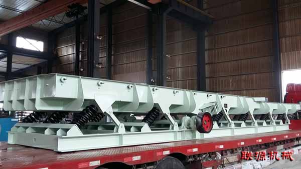 輸送槽與底架之間用螺旋彈簧聯接,該彈簧是主振彈簧,導向桿起輸送槽振動導向作用,輸送機運行中驅動機構使連桿端部作往復運動,而連桿通過其端部的螺旋彈簧帶動輸送槽作往復運動,使物料沿振動方向被連續拋起向前跳躍,達到輸送物料的目的。