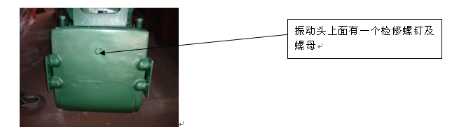 (2.2):松檢修螺釘。 將殼體上下面聯(lián)接叉定位螺釘即檢修螺釘松開≥10mm左右后將螺母拼緊。如圖示在振動器的上面有一個檢修螺釘,振動器的下面有成三角形的三個檢修螺釘。